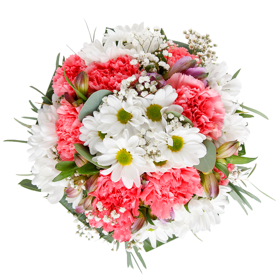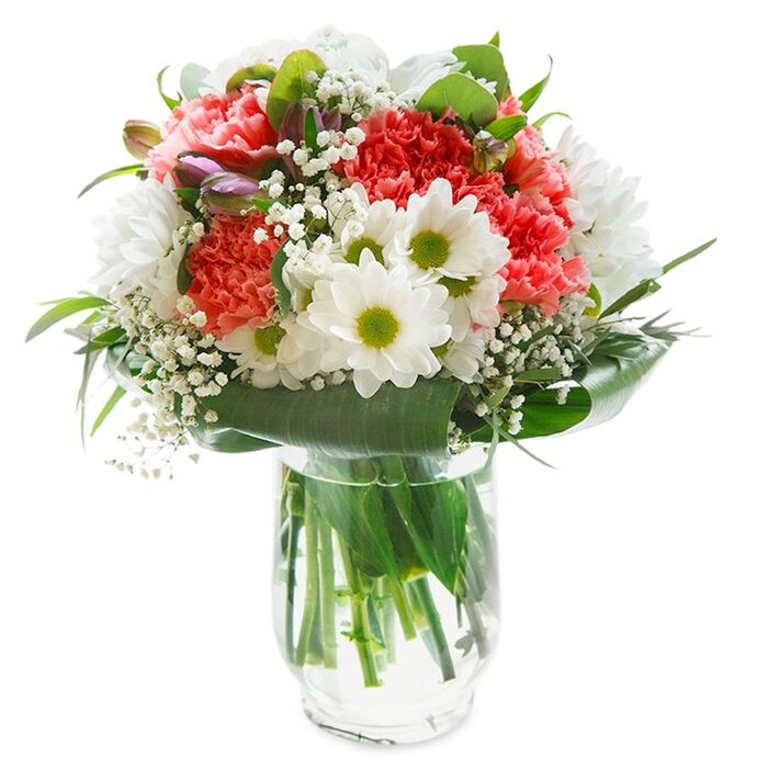 Illuminate any space with our radiant white and pink floral arrangement. This stunning bouquet showcases snow-white chrysanthemums, delicate gypsophila, and vibrant light pink carnations, all artistically arranged with aspidistra leaves. The unique design and soft color combination make it an ideal luxurious gift.